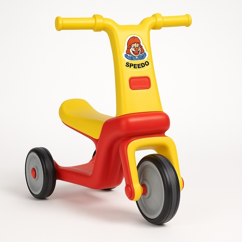 Red and Yellow indoor tricycle for kids, model Speedo. Features durable PVC construction with dimensions of 71.5x34x62 cm. Proudly made in India for young children.