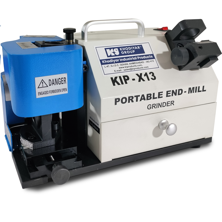 Resharpens end mills from 4mm to 14mm with 0-5 degree apex angle. Utilizes ER 20 collets, 4500 rpm no-load speed, and weighs 15 kg.