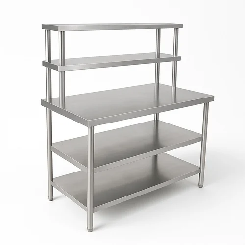 Wall-mounted stainless steel pickup table for restaurants. Features 4 shelves and a silver finish. Designed for efficient kitchen workflow and service.