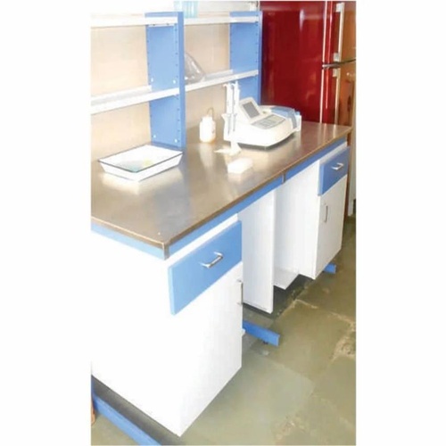 Rectangle cluster lab furniture in white and blue. Eco-friendly, made from wood and metal. Suitable for lab usage. Made in India.