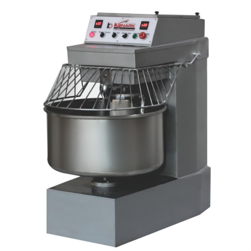Automatic spiral mixer with 10 kg dry flour capacity and 17 kg dough capacity. Features 1.5 HP connected load, 220 Volt, 50 Hz operation, and stainless steel construction.