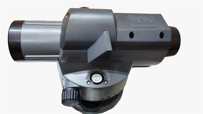 Kryptton K-24 automatic level with a metallic body. Features IPX6 dust/water protection, +/- 15' compensator range, and 1.0m minimum focus. Packaged in a carton box.