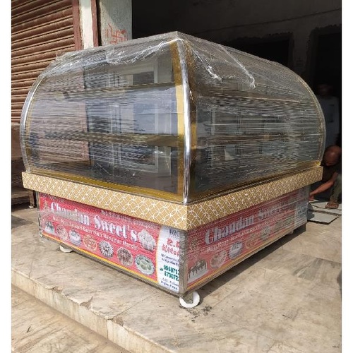 L-type display counter, non-air-conditioned. Constructed from stainless steel, it includes four shelves for commercial applications. Designed for durability and efficient product presentation.
