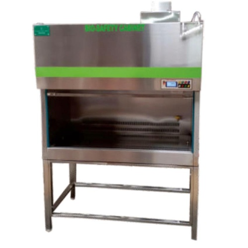 Laboratory Bio Safety Equipment with HEPA filter and stainless steel construction. Operates on 60 Watt with a noise level of 50-65 DB. Made in India.