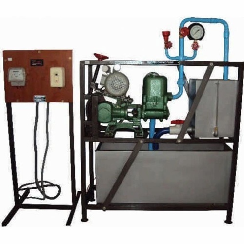 Laboratory reciprocating pump test rig. Features steel construction, 3-phase, 60 Hz, 260 V operation. Specifically designed for air compressor testing and engine component evaluation in laboratory settings.