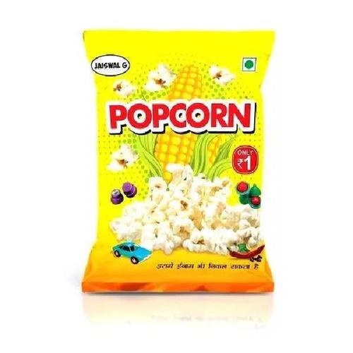 Printed laminated plastic pouch for popcorn packaging. Heat seal closure with a 50 gm - 500 gm capacity range.