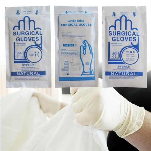 Medium-sized disposable latex gloves for surgical use. White color, 260 mm sleeve length. Packaged for convenient access and sterile handling. Ideal for medical examinations.