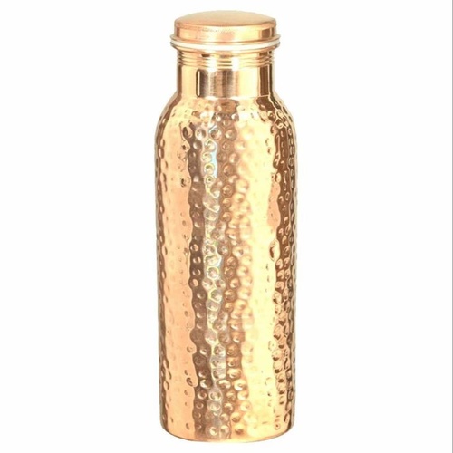 Round, textured copper water bottle with a leak-proof screw cap. 900ml capacity, yellow color. Packaged in a box with a 3-4 day delivery time.