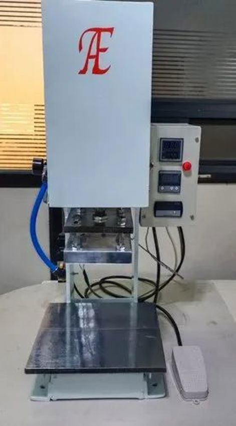 Semi-automatic electric leather embossing device. Features a 220V single-phase power source, 100mm stroke, and MS plate body. Designed for hot embossing.
