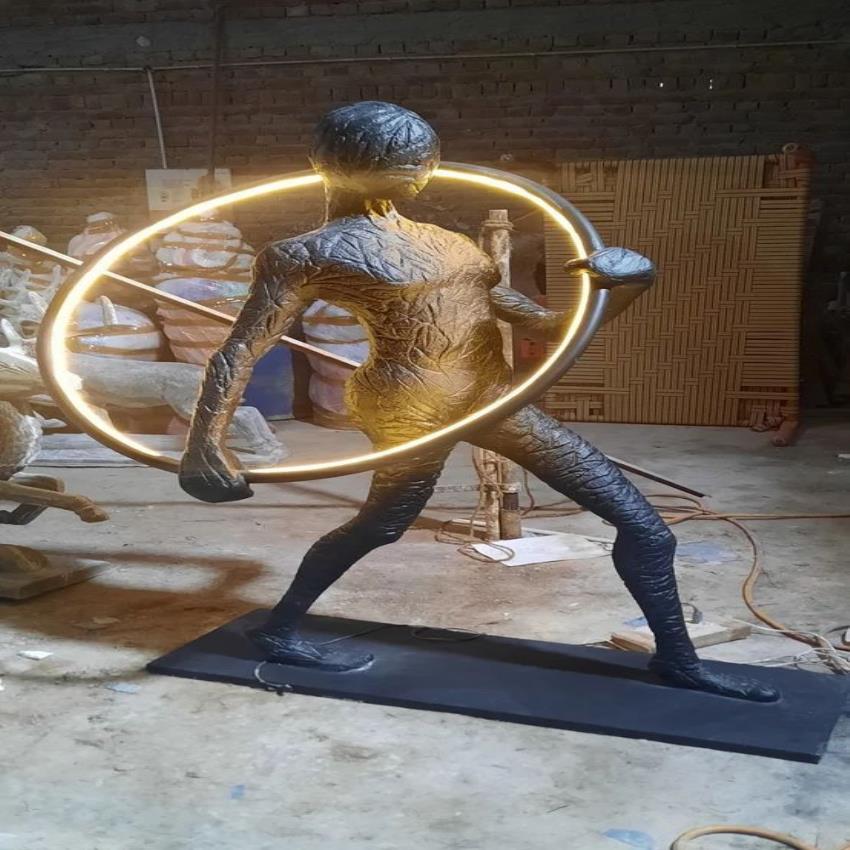 This modern man lamp is constructed from brown fiberglass and features polished finishing. It utilizes LED lighting and stands at 6 ft, ideal for decorative applications. Made in India.