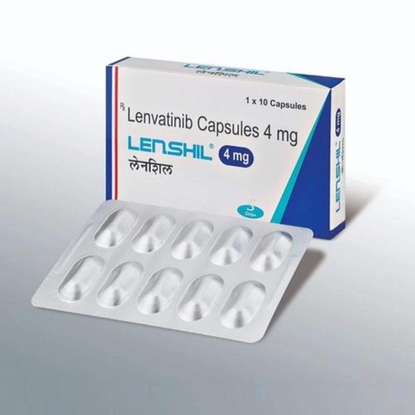 Lenvatinib Mesylate capsules for cancer treatment. Available in 4mg and 10mg strengths, packaged as 1x10 capsules per box. Prescription required. Manufactured by Shilpa Medicare.