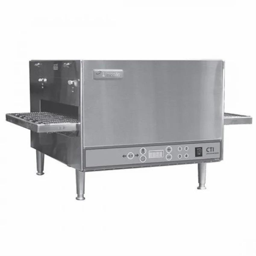 Lincone electric semi-automatic belt conveyor oven, Model 2504. Produces 18x12" pizzas per hour at 6min/deck. Belt conveyor oven type.