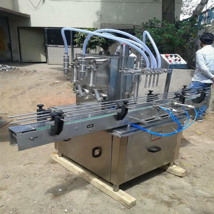Automatic liquid filling machine, 2 HP, 50 Hz, 80 bottles/minute capacity. Single Phase, 220V, stainless steel body. Suitable for pharmaceutical applications.