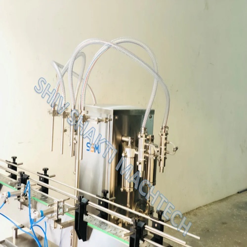 Volumetric liquid soap filling machine (LF-100) with 4 filling heads. Operates on 220V, 1 phase, 50 Hz. Features a 6ft conveyor with left-to-right movement and pneumatic bottle stopper.