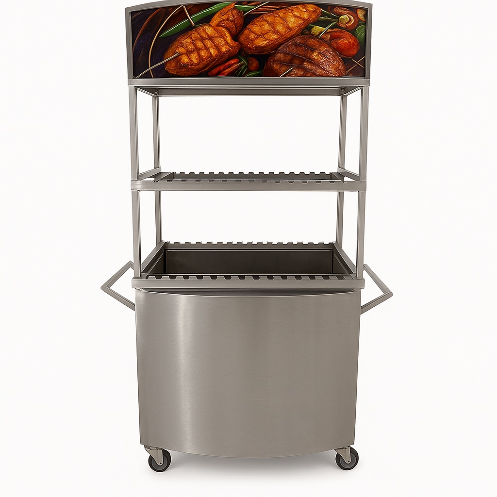 This live BBQ trolley facilitates outdoor grilling. Its design supports charcoal-based cooking for a traditional BBQ experience. Ideal for events and culinary setups.