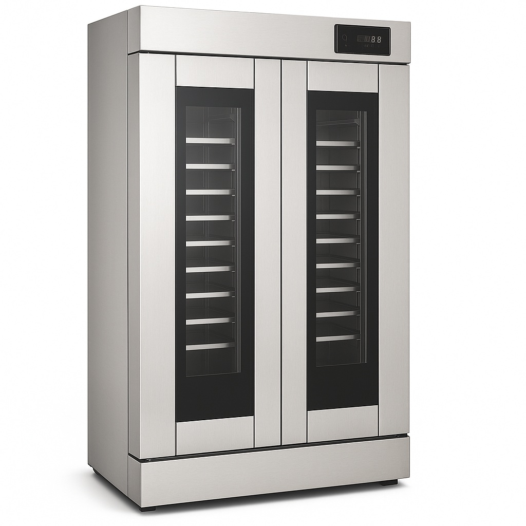 2.8 kW stainless steel convection prover oven, model LJ-26. 60 Kg/Hour capacity, 1000 x 690 x 1660 mm dimensions. Features a double door and operates on 220 V.