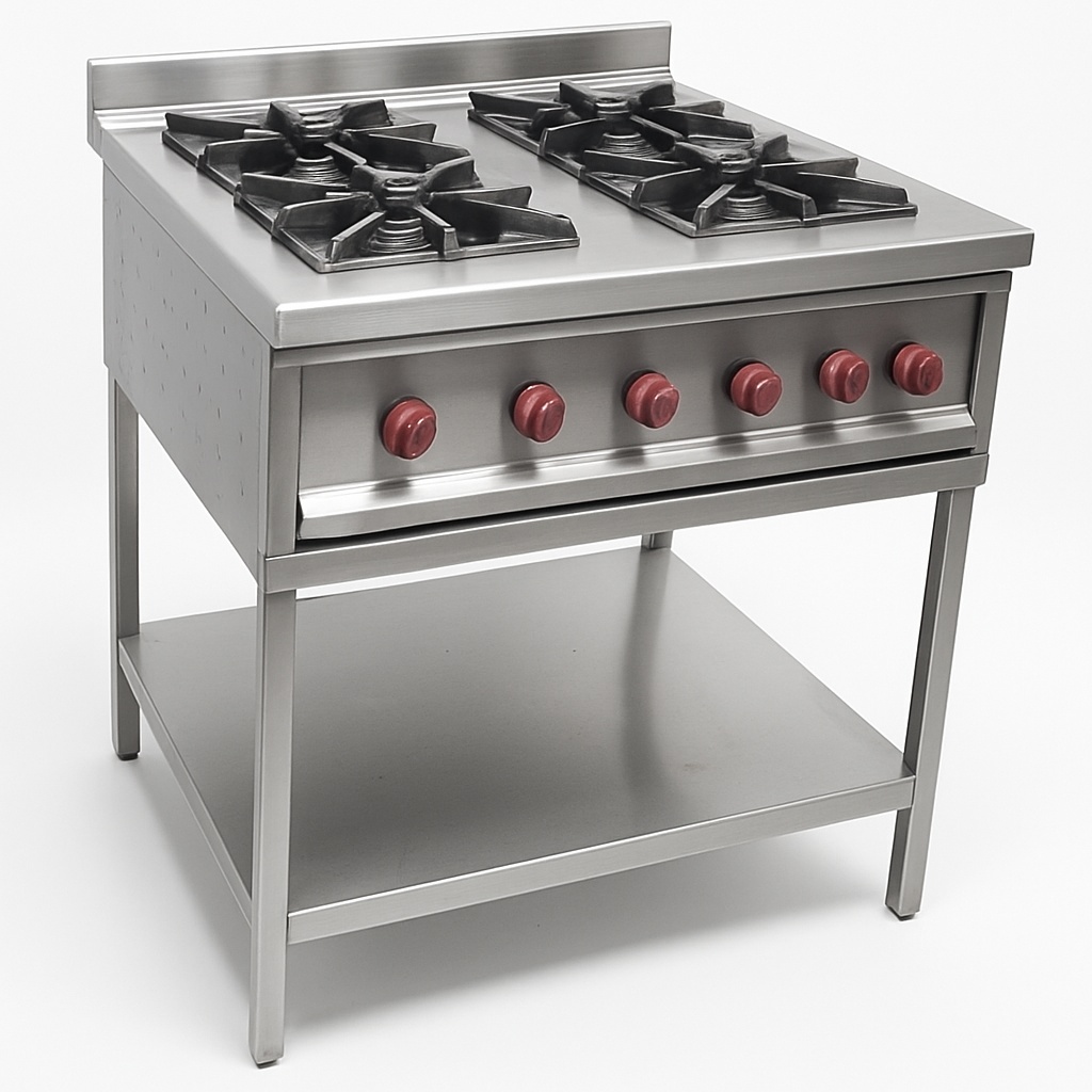 Stainless steel LPG four burner range for commercial use. Features rust-proof construction and a powder-coated surface finish. Designed for demanding professional kitchens.
