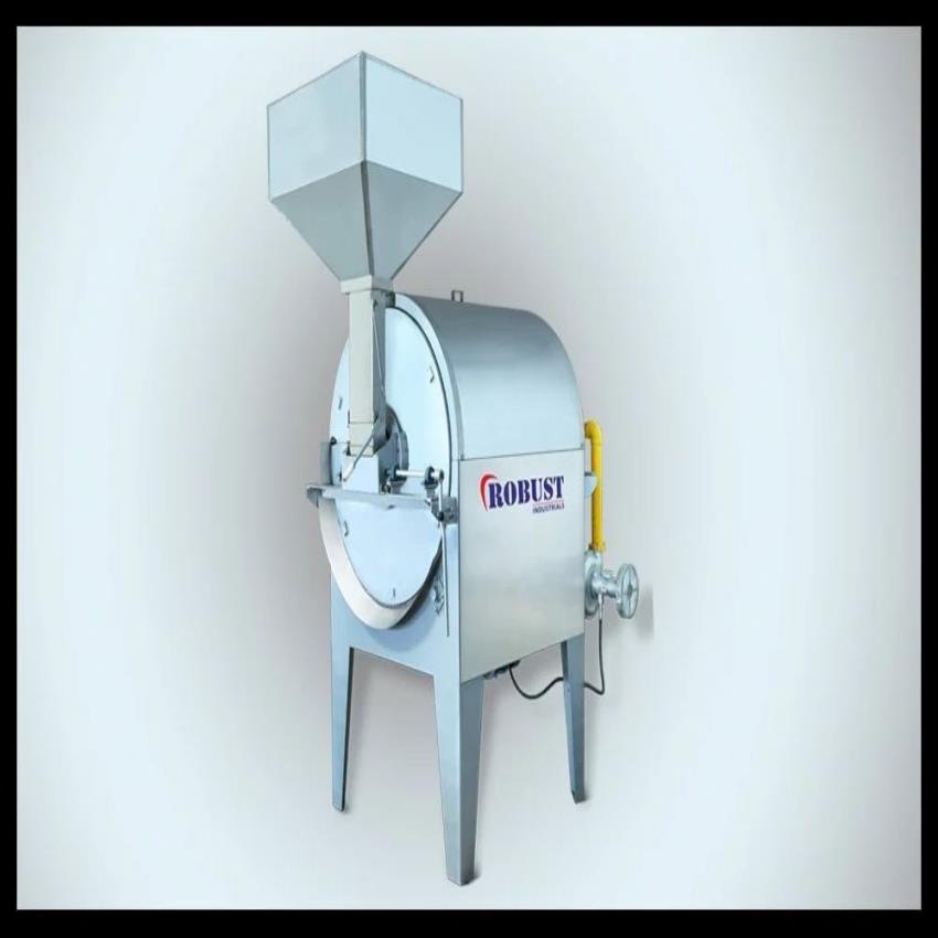Industrial automatic LPG radiant heating rotary batch roaster. 1000 Kg/hour capacity, 2.2 kW power consumption. Dimensions: 5 x 6.5 x 12 Feet.