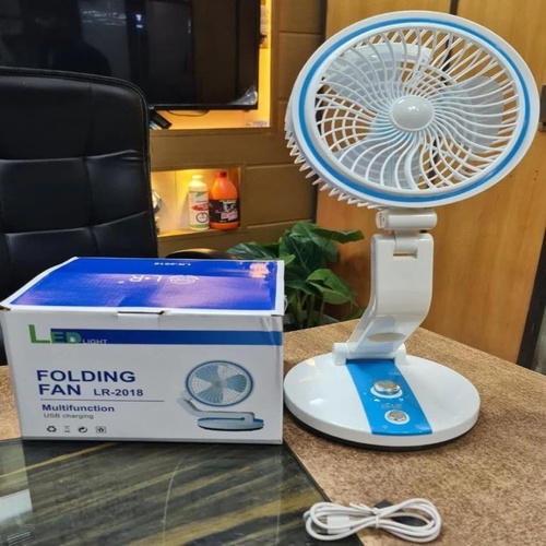 Blue plastic round mini fan, small size, foldable design. Ideal for personal use. Packaged in a box.