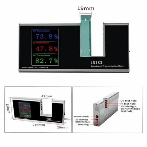 LS-183 industrial spectrum transmission meter. Features 365 nm UV peak wavelength, 0.1% resolution, and < 47mm sample thickness. Includes 5V AC/DC adapter. Made in India.