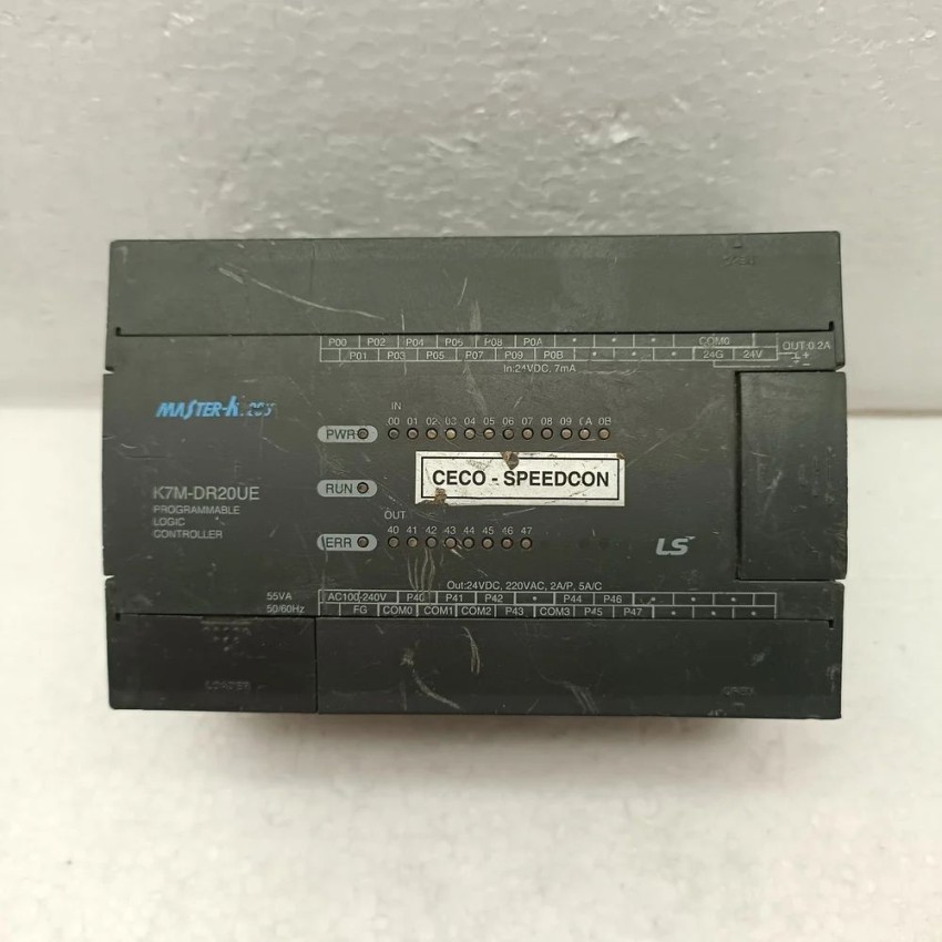 LS PLC Master Series module, K7M-DR20UE. Features DC24V 7MA / AC220V 2A I/O points, digital output. DIN rail mounting type, suitable for PLC applications.
