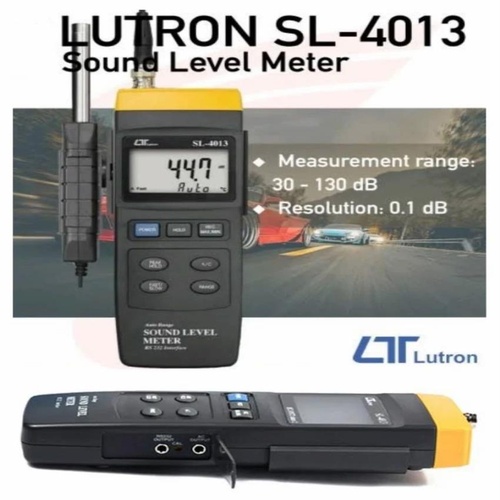 Lutron SL 4013 digital sound level machine, Made in India. Measures 30-130 dB with 1.0 dB accuracy and 0.1 dB resolution. Operates on 9V battery, less than 80% RH humidity.