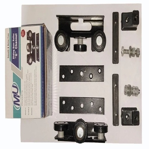 M S roller bearing with an L-shaped bracket. Black color, black-P.C. finish. Side and top mount type. Suitable for door applications, made in India.