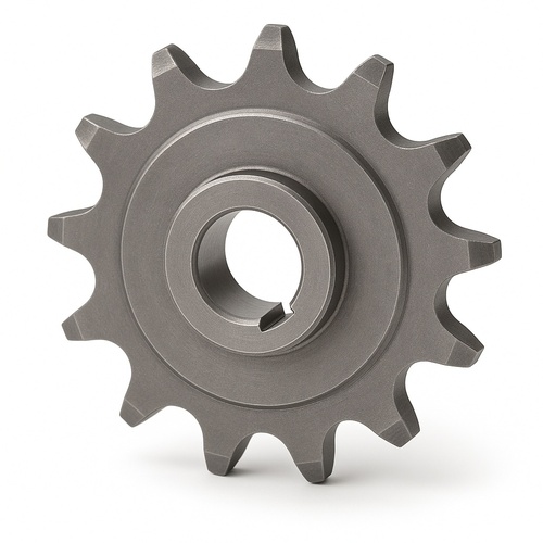 Machined simplex roller chain sprocket wheel for conveyor systems. Features 13 teeth, 12.7mm pitch size, 12.7mm bore size, and hardened teeth.