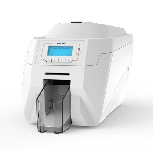 This Magicard ID Card Printer offers colored, double-sided printing. It has a 100-card capacity and an output hopper for 30 cards.