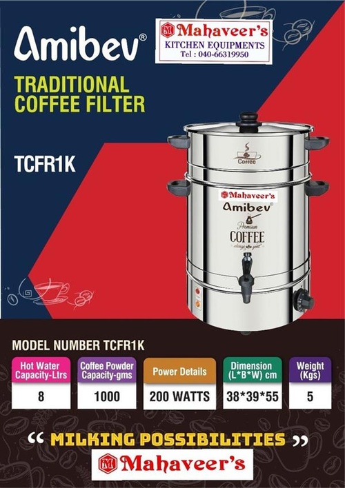Manual operation traditional filter coffee maker with a 10-liter capacity, brewing up to 10 cups. Includes a 1-year warranty. Ideal for large batches of filtered coffee.