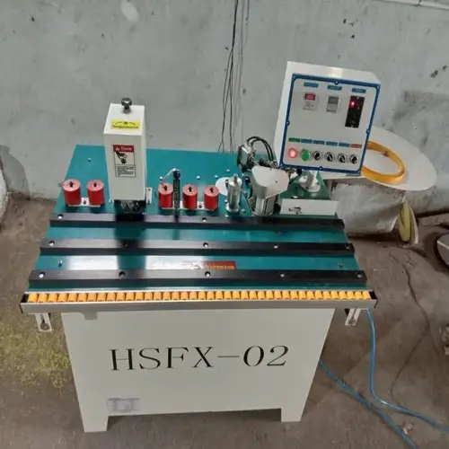 Manual edge banding machine with frequency speed adjustment. Offers feeding speed of 15 m/min. Handles edge banding thickness 0.3-3mm and width 10-50mm. Minimum working radius 20mm.