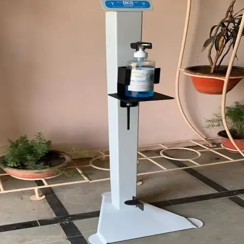 Manual foot pump sanitizer stand equipment in mild steel. Features black and orange color, adjustable foam and leather seat, and 35mm rod size for gym use.