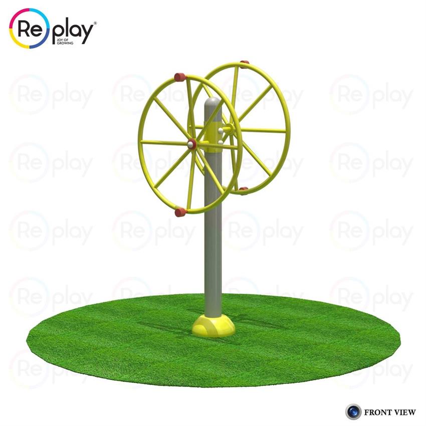 Green, manual outdoor shoulder builder equipment. Non-portable, two-wheel design. Model: Outdoor Two Wheel Shoulder Builder. Built for effective shoulder training.