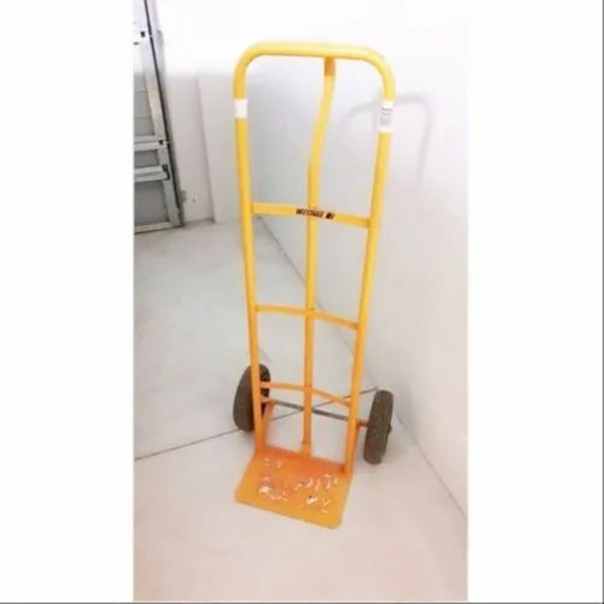 Mild steel manual hand trolley for warehouse use. Load capacity 50-100 kg. Features 2 wheels and color-coated surface treatment.
