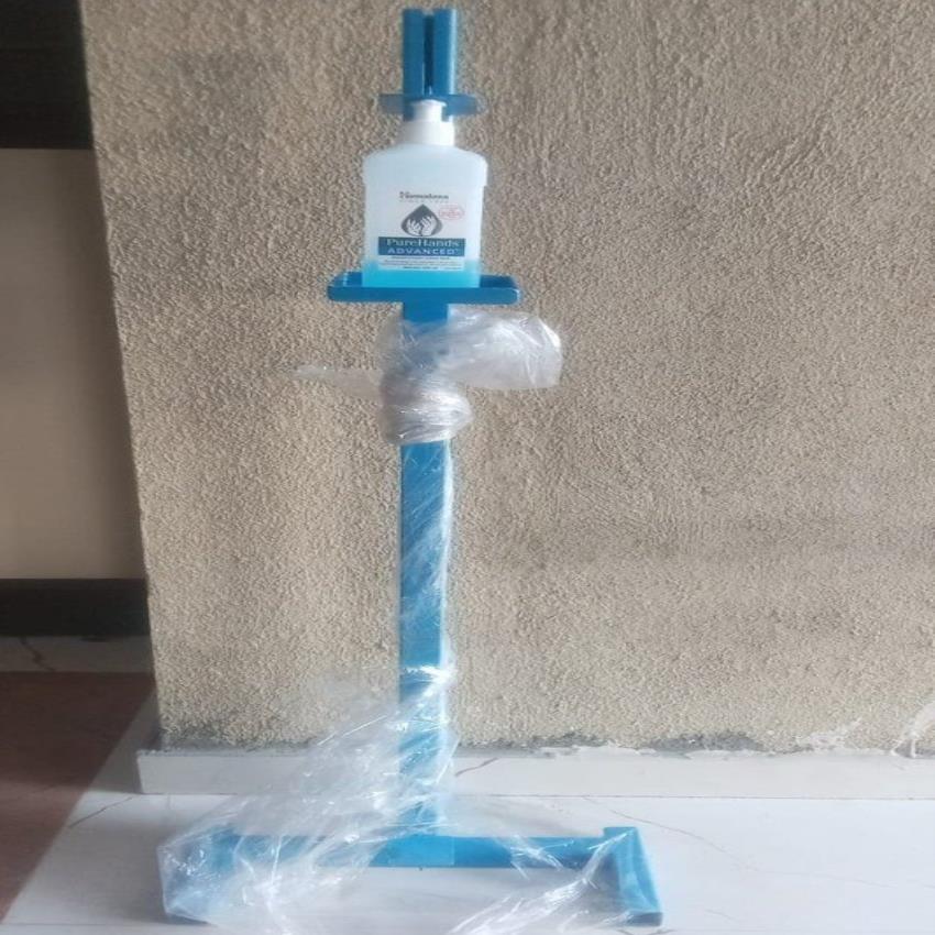 Manual hand sanitizer stand equipment constructed from mild steel. Designed for ease of use with a focus on functional operation.