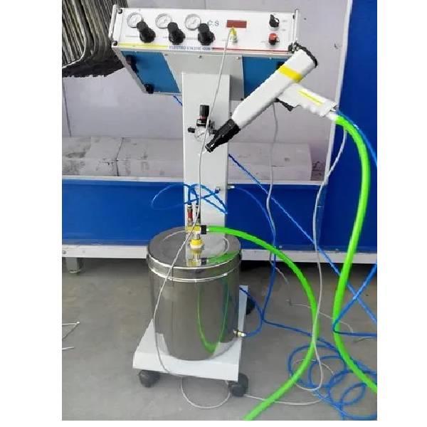 Manual powder coating equipment weighing 55kg. Operates at 100V. Compact dimensions of 112x63x58cm. Designed for manual application of powder coatings in various settings.