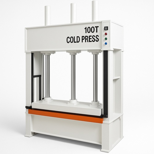 Manual woodworking cold press machine, 100 Ton capacity. 7 HP power, 4 cylinders. Size 2500x1300 mm. Made in India for wood press applications.
