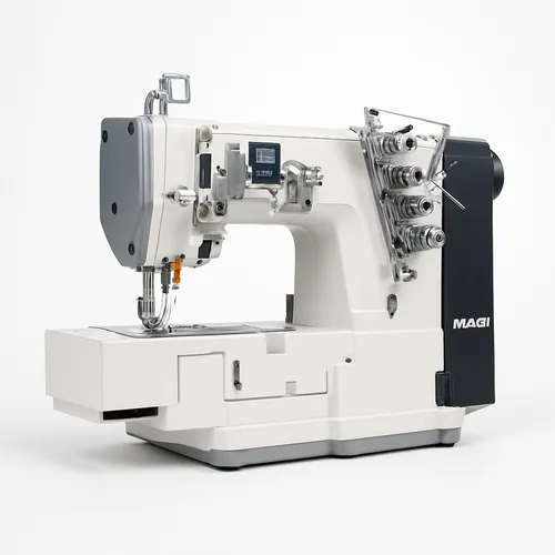 Semi-automatic electric interlock machine with 3 needles and 5.6mm needle distance. Features direct drive motor and 4000-5000 stitches/min speed. Plan uberdeck type for efficient operation.