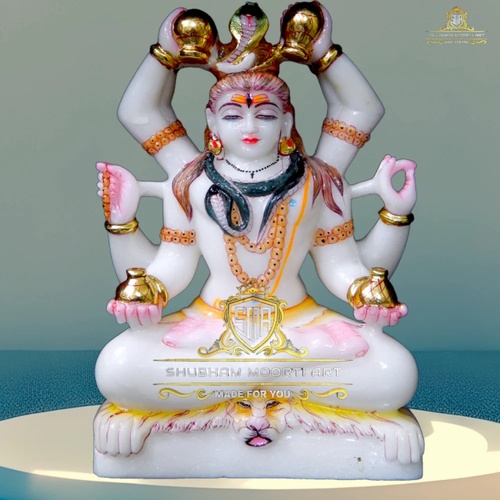 Handcrafted white marble Mahamrityunjaya statue with glossy, polished finish. Features dancing mudra, rectangular base, and Nandi. Suitable for worship and comes in a wooden box. Already assembled.