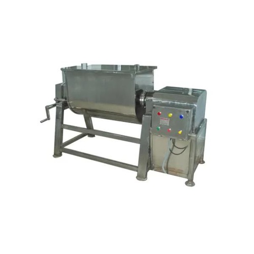 Semi-automatic pharma mass mixing device. Stainless steel construction with a 3 HP drive motor. Features tilting alignment, 50 Hz frequency, and 35 RPM speed. Customized design.