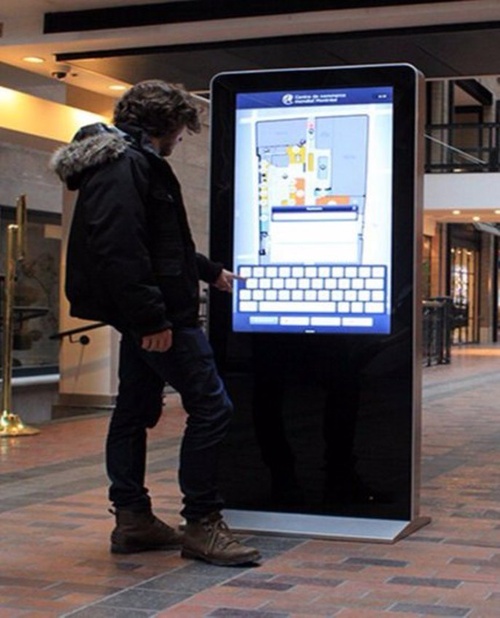 40-inch LCD digital advertising kiosk, metal construction, black and silver finish. Features HD display, USB ports, audio, and printing. 220V, 1-year warranty.