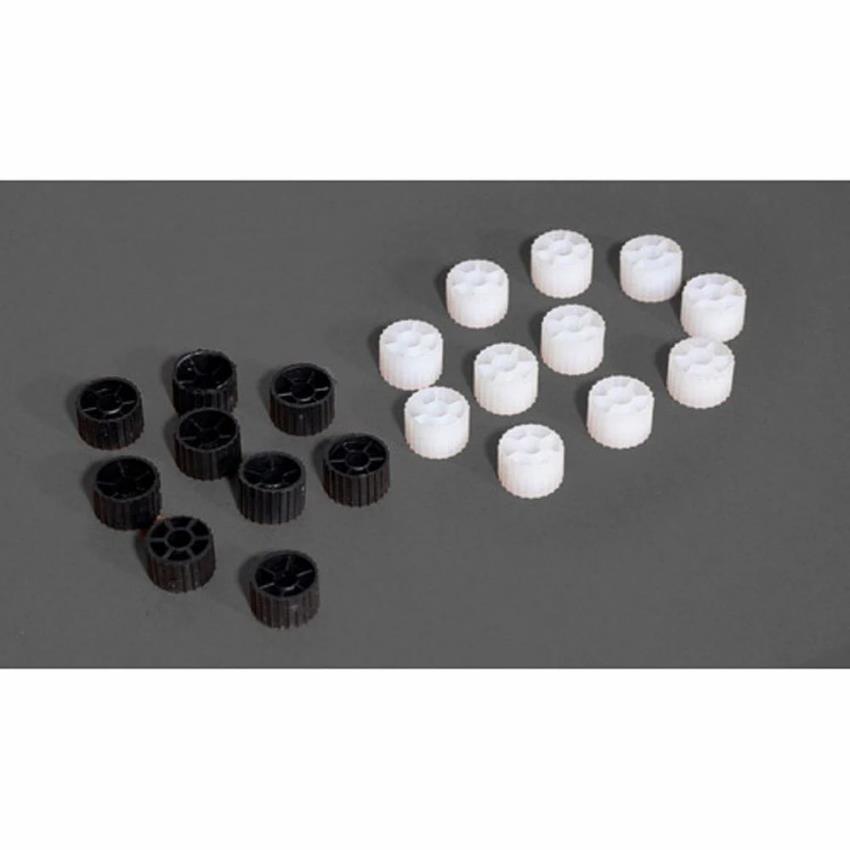 MBBR bio pac media in black and white. 1 gallon size, 32 mm diameter. Made in India. High surface area for efficient wastewater treatment.