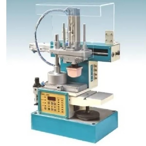 Automatic pad printing machine, 3000 prints/hour capacity. 5-6 Bar compressed air pressure, 1100 Kg weight. Dimensions: L-585 mm, W-453 mm, H-610 mm.