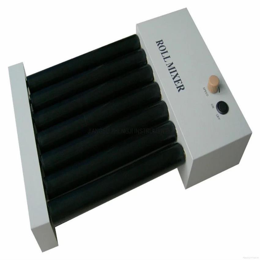Hospital-grade mechanical blood roller mixer with adjustable speed (30-80 RPM). Features high-quality, chemical-resistant construction and accommodates up to 15 blood tubes on 5-10 rollers.