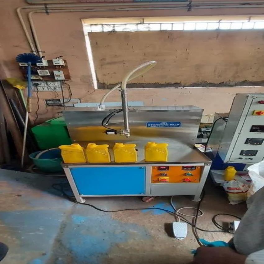 Semi-automatic mechanical filling machine for viscous liquids like soap oil, medical syrup, and juices. Stainless steel contact parts. Fills 5ml to 5ltr bottles at 900-1500 bfh.