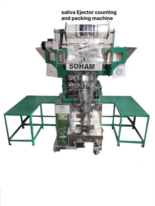 Automatic medical saliva counting and packing machine. Features 2HP single-phase operation, capable of up to 4 pouches/minute. Uses BOPP rolls for packing.