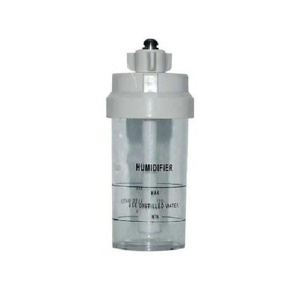 Standard humidifier bottle for medical use. Designed to attach to oxygen flowmeters and provide humidified air. Essential accessory for oxygen therapy.