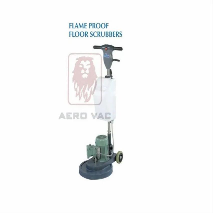 Semi-automatic metal body flame proof floor scrubber machine with 1 brush, 1.5 HP motor. Operates on 440V, 3-phase power. Model: FLP SCRUBBERR.