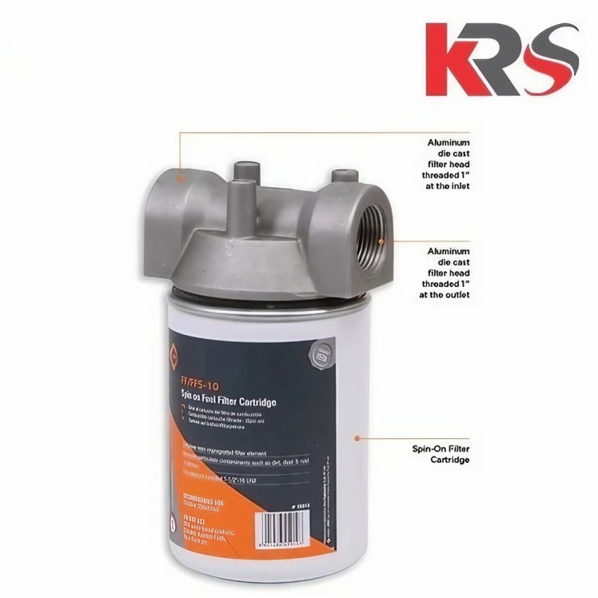 Metal cartridge fuel filter with 3/4-inch or 1-inch diameter. Operates at 50 PSI, filters down to 10 microns, and has a 75 LPM flow rate.