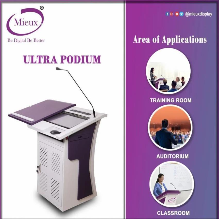 Durable metal digital podium with flat reading table for colleges and schools. Offers customizable color options. Includes 1-year warranty. Ideal for educational institutions.